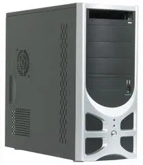 This case is black; its silvery faзade has black details, too. The front panel has four open bays for 5.25” devices and for one 3.5” device (drives with a silvery or black case are going to look well here). One plastic bracket in a 5.25” bay may be left in place – it has a cut for the tray of the optical drive and an Eject button.