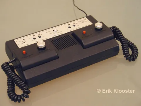 The case design is not particularly original: black rectangle with two detachable controllers and a wide control panel at the top. The controllers are also rectangular with a dial to move the bat on screen and a red button each, one to serve (left player) and the other to reset the game (right player).