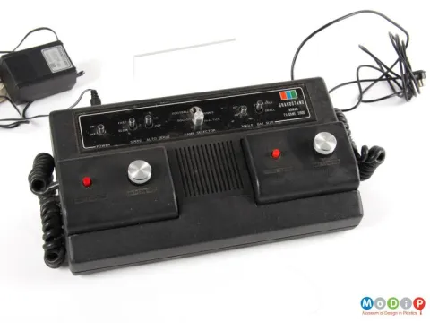 The case design is not particularly original: black rectangle with two detachable controllers and a wide control panel at the top. The controllers are also rectangular with a dial to move the bat on screen and a red button each, one to serve (left player) and the other to reset the game (right player).