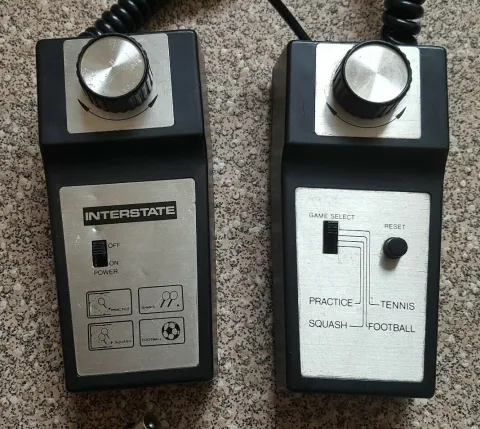 Interstate Mini TV Game 1104 was a console manufactured by Interstate Electronics in 1977. These two little controllers played a mean game of PONG on your TV. It was an unusual configuration as all of the electronics were built into the two hand controllers whereas most of its competitors had consoles which contained the electronics. No doubt due to the lack of space, their variations on tennis are quite limited on this TV game.