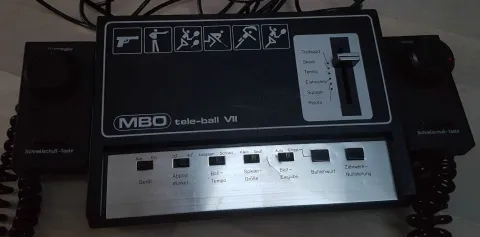 MBO produced a large series of pong systems that they named "Tele-ball" with numbers from 1 to 9 (or more ?). But there did not seem to be any real evolution as this model 2 for example, displays nearly the same features as the model 7 except for the 2 shooting games. The chip included in the Tele-ball VII is dated from 1977 as the one included in the Tele-ball II. So maybe they made different shapes at the same time just to propose "different products" and to sell more.