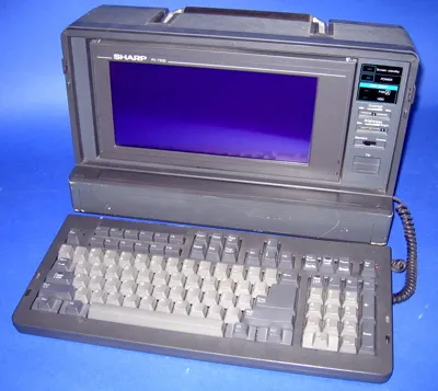 Sharp PC-7200 luggable portable with LCD display, keyboard and cables introduced in 1987. It replaced Sharp earlier models 7000 and 7001.