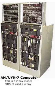 The AN/UYK-7 was the standard 32-bit computer of the United States Navy for surface ship and submarine platforms, starting in 1970. It was used in the Navy's Aegis combat system and U.S. Coast Guard[2], and the navies of U.S. allies.[3] It was also used by the U.S. Army.[4] Built by UNISYS, it used integrated circuits, had 18-bit addressing and could support multiple CPUs and I/O controllers (3 CPUs and 2 I/O controllers were a common configuration). Its multiprocessor architecture was based upon the UNIVAC 1108. An airborne version, the UNIVAC 1832, was also produced.