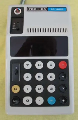 The Toshiba BC-1205B is an arithmetic calculator with 12 digits precision and algebraic logic. It has 4 functions, 18 keys and an LED (light-emitting diode) display, typical of calculators of this era. The power source is 5xAA batteries.