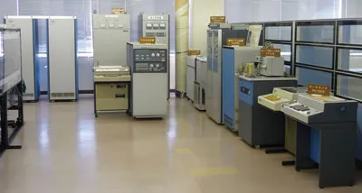 The FACOM 230-25 is one of the representative models of medium computers in the age when computers began to spread in Japan for commercial use. The preserved system in the photograph consists of the FACOM 230-25 computer system and the set of peripherals to perform some service.