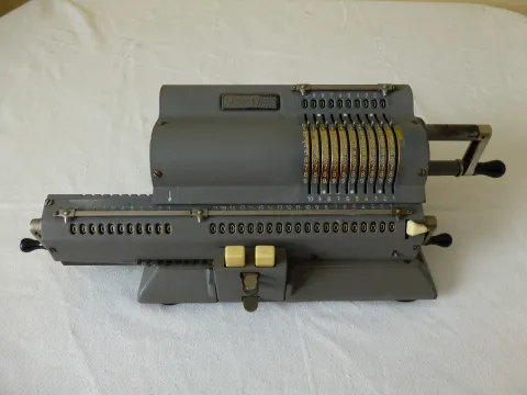 Model 125 is a full-featured wide-carriage machine with a 20-digit accumulator, a setting check dial, a back transfer mechanism, and a tens-carry mechanism with automatic reversing on the counter register. The machine is finished in the new grey colour scheme from 1952.