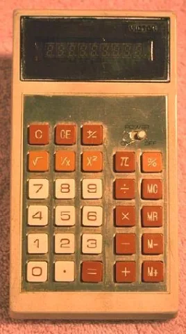 The Victor 104R is an arithmetic calculator with 8 digits precision and algebraic logic. It has 10 functions, 28 keys and a VFD (vacuum fluorescent) display. The power source is 3xAA batteries.