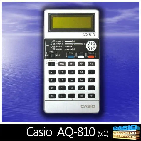 The Casio AQ-810 is an arithmetic calculator with 8 digits precision and algebraic logic. It has 6 functions, 27 keys and one of the early LCD (liquid crystal) displays which incorporated a yellow filter. The power source is 2x1.5V cell. The calculator was manufactured in Japan.
