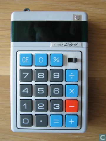 The Citizen Eight is an arithmetic calculator with 8 digits precision and algebraic logic. It has 6 functions, 19 keys and a VFD (vacuum fluorescent) display. The power source is 3xAAA batteries.