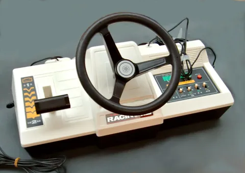 All HardwareThe Color TV Game Racing 112 is the third unit of the Color TV Game series and it was published on June 8, 1978. It is significantly larger than the previous two units, with a larger shipping box to accompany it. Racing 112 was set to be released at ¥18,000, but was lowered to ¥12,000 to ensure competitiveness. It was later reduced to ¥5,000. To prevent the machine from requiring a larger box, the wheel is detachable from the console. The built-in game is a top-down racer similar to Speed Race, an arcade game released by Taito in 1974. Variations include a smaller screen width and opponents that move faster, with all possible game combinations totaling to 112. The console also comes with two paddle controllers that allow for multiplayer.