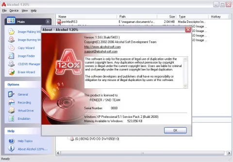 Alcohol 120% can handle the creation of 31 virtual CD and DVD-ROMs, letting users play discs without needing the physical disc. Users can copy CDs and DVDs to CD-R, CD-RW, DVD-R, DVD+R, DVD-RW, DVD-RAM, and DVD+RW discs. The reading speed of a virtual CD-ROM is 200x. It supports normal CD, DVD, and CD RAW subchannel reading methods. The RAW reading method lets users emulate all CDs. Alcohol 120% supports numerous CD (CD-DA, CD+G, CD-ROM, CD-XA, VideoCD, Photo CD) and DVD (DVD-ROM, DVD-Video, DVD-Audio) formats. It also supports all current (ATAPI & SCSI) drives. The latest version adds two more profiles to the data type options and includes support for unusually formatted DVD+RW discs formatted by other software.