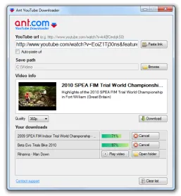 The Ant YoutTube Downloader is a useful free standalone program that allow you to download videos from youtube.com and save them in your hard drive. The software doesn't need to be installed, you can directly launch it by clicking on the .exe file. Once the software launched, it is very easy to use : Just paste the URL from youtube of the video you want to download on the top field, then click on the download button. You can download several videos at the same time, and access them directly via the software download manager once the downloads are finish.