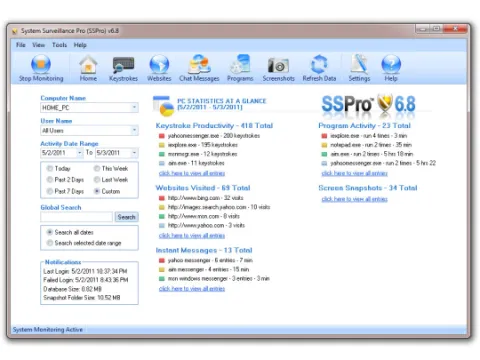Are you a concerned parent in need of parental control software to monitor your children online or an employer who needs to restrict employee computer usage? SSPro is the award winning all-in-one computer monitoring software product that has become an essential tool for concerned parents and network administrators. SSPro will log keystrokes typed - keylogger, monitor applications run, track websites visited, record instant message conversations and capture screenshots of the computer desktop. Logged data is neatly organized by machine name and date and is displayed with the current Windows login as well as the corresponding time of activity.