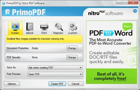 The world's #1 free PDF creator. PrimoPDF a free tool for high-quality conversion to PDF, comprising a user-friendly interface that enables printing to PDF from virtually any Windows application. Additionally, PrimoPDF provides the ability to optimize PDF output for screen, print, ebook, and prepress, secure PDF files with 128-bit encryption, and add document information (e.g. title, author, subject, keywords) to converted PDF files. Full support for 64-bit machines, double byte character and non-TrueType font support, and improved PDF output also available.