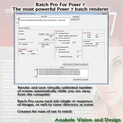 Batch Pro for Poser is a plug-in that allows the user to render multiple Poser files automatically. With all the long hours you put into your projects there is still a large number of hours that may be thrown away each day while you eat, sleep, or just tend to your daily life that doesn't involve 3D projects. With Batch Pro you can set up multiple scenes with different camera angles, lights, renders settings, etc. and render them while you are away from your computer thereby increasing productivity and regaining hours of lost opportunity.