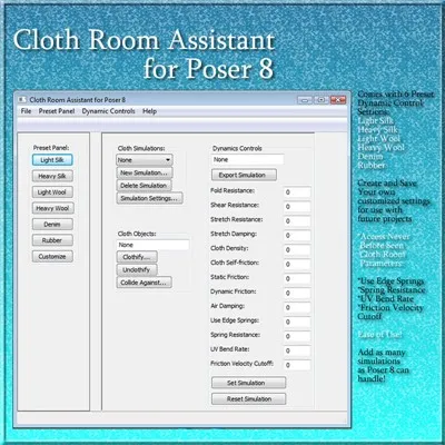 Cloth Room Assistant for Poser 8 provides Poser 8 users with access to the never before seen Cloth Room parameters: Use Edge Springs, Spring Resistance, UV Bend Rate, Friction Velocity Cutoff. Cloth room comes with 6 Preset Dynamic Control Parameter sets including "Light Silk", "Heavy Silk", "Light Wool", "Heavy Wool", "Denim", and "Rubber".